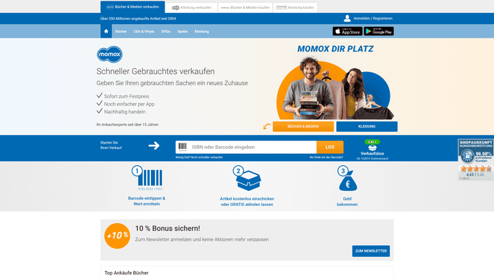 momox ist eines der ersten deutschen Ankaufportale am Markt und ging schon 2006 online. Im Gegensatz zu den anderen hier getesteten Portale kauft momox ausschließlich Medienprodukte wie Bücher, CDs, DVDs sowie Kleidung an, aber keinerlei Elektronik-Geräte. Die angekauften Artikel werden dann über den hauseigenen Second-Hand-Shop medimops weiterverkauft.