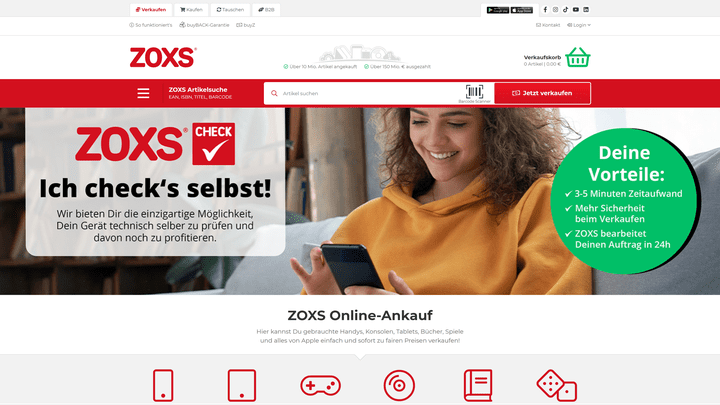 Testsieger ZOXS ist wohl eine der bekanntesten Recommerce-Plattformen auf dem deutschen Markt. Insbesondere das breite Spektrum an Artikeln, die du hier verkaufen kannst, macht ZOXS zu einem der Marktführer der Branche.