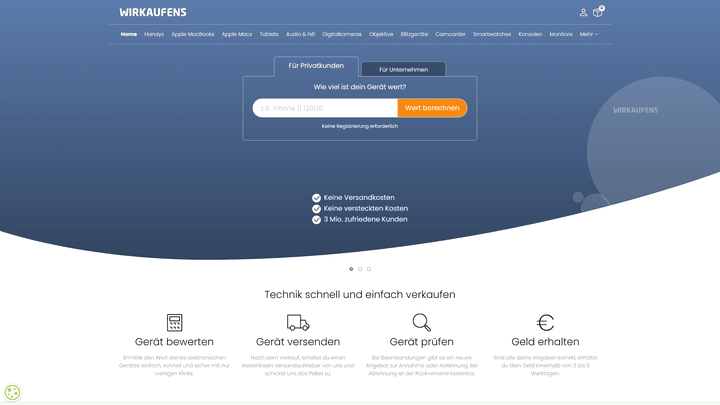 Wirkaufens bietet ein breites Portfolio und kauft, Handys bzw. Smartphones, Konsolen und Zubehör, Tablets, Laptops bzw. Notebooks, Computer-Zubehör, Kameras und Zubehör, Wearables und Audio-Produkte an. Der Fokus liegt auf Geräten von Apple, aber auch Produkte anderer Hersteller wirst du hier los. 80 von 105 Produkten bin ich hier losgeworden; das ist zwar ein gutes Ergebnis, im Vergleich mit den anderen Anbietern aber relativ wenig.