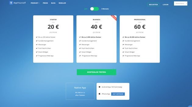 Je nach Anzahl der aktiven Nutzer kostet AppYourself monatlich zwischen 20 und 80 Euro. Gegen einmalige Gebühren können Sie sich auch native Apps für Android – für 50 Euro – oder iOS – Preis auf Anfrage – erstellen lassen. Abgerechnet wird jährlich.