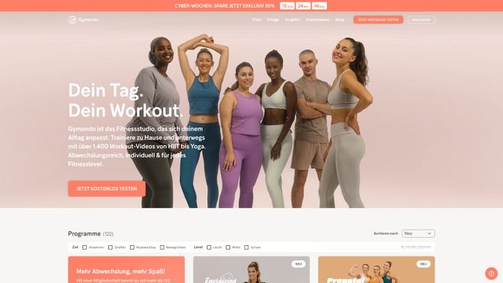 Gymondo ist eine Fitness-Plattform mit mobiler App und einer riesigen Auswahl an Online-Workouts, Trainingsplänen und Ernährungsprogrammen. Die Fitnessziele reichen von Gewichtsverlust über Muskelaufbau und Flexibilität bis zu allgemeiner Fitness. Besonders gefallen haben mir die speziellen Angebote für Frauen!