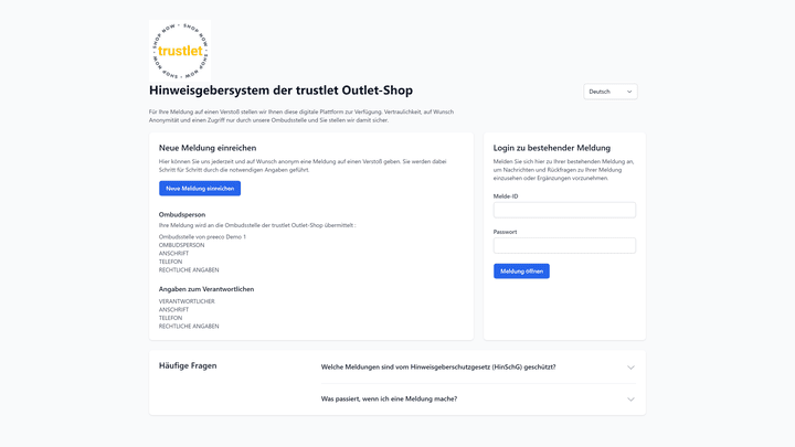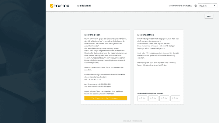 Ein Hinweisgebersystem ist im Grunde ein Meldekanal für (anonyme) Hinweise im Unternehmen, zum Beispiel eine Telefon-Hotline, ein Beschwerdebriefkasten, eine E-Mail-Adresse, eine externe Ombudsperson oder – wie hier im trusted-Test – eine spezielle Whistleblowing-Software. Über einen solchen Meldekanal sollen Hinweisgeber:innen (bzw. “Whistleblower”) z. B. Gesetzesverstöße oder ethische Missstände melden können.