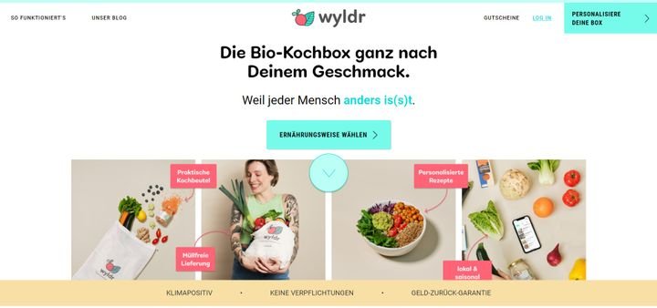 Wyldr besticht mit regionalen und saisonalen Zutaten in Bio-Qualität und einer auf Nachhaltigkeit ausgelegten Verpackung. Ihr könnt jederzeit aus rund 2.000 Gerichten wählen, ein Großteil davon vegan bzw. zumindest vegetarisch. Anders als andere Kochbox-Anbieter, die jede Woche wechselnde Gerichte im Programm haben, habt ihr bei Wyldr fast ständig Zugriff auf alle Rezepte – solange die Produkte gerade Saison haben.