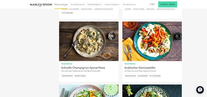 Rund die Hälfte der 40 wöchentlich wechselnden Gerichte bei Marley Spoon sind vegetarisch; Veganer:innen haben immerhin eine Auswahl aus rund 6 bis 7 vollkommen pflanzlichen Rezepten. Darunter sind Gerichte wie Pilzrisotto mit Spinatpeso, Penne mit Mandeln und Brokkoli, Bao-Buns mit glasiertem Tofu oder orientalische Röstkartoffeln. Das Angebot ist damit leicht größer, als beim Marktführer HelloFresh.