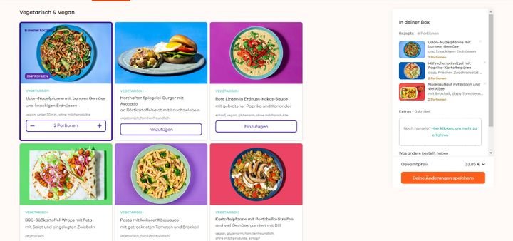 Marley Spoon bietet ein ähnliches Konzept, wie HelloFresh: wöchentlich wechselnde Gerichte, ein flexibel pausierbares und kündbares Abo und eine vielseitige Auswahl von Rezepten und Zutaten. Dabei fallen die Rezepte im Vergleich zu HelloFresh oft fantasievoller aus, sind aber auch teurer. Die Auswahl für Vegetarier:innen und Veganer:innen ist ebenfalls ein wenig umfassender – reicht aber immer noch nicht an Wyldr oder Good Bank heran.