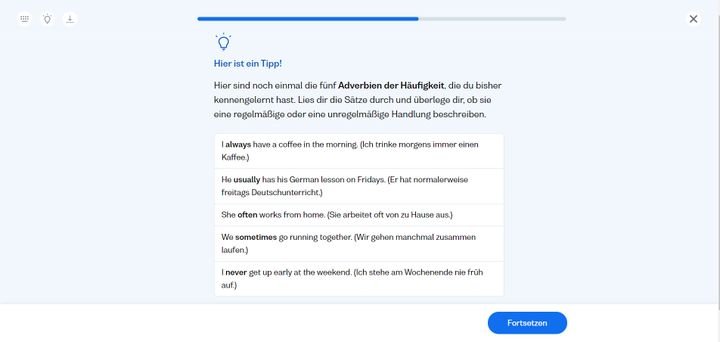 - Einstufungstest: Der Einstufungstest ist schnell erledigt, hat mich aber trotzdem erfreulich präzise eingeordnet.