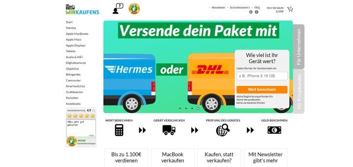 Wirkaufens gilt als einer der Marktführer im Elektronik- und Handy-Ankauf und glänzt in meinem Test mit soliden (wenn auch selten den höchsten) Preisen. Ein besonderer Service ist die Datenlöschung der eingeschickten Geräte – damit ersparst du dir, dein Handy selbst zu bereinigen und zurückzusetzen.