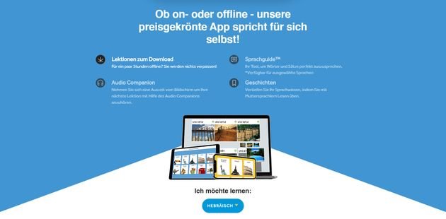 Der Online-Sprachkurs von Rosetta Stone ist sowohl für Anfänger als auch für fortgeschrittene Lerner empfehlenswert. Denn dieser nutzt einen simplen Ansatz: Um schnell Erfolge zu erzielen, ist es wichtig, die Sprache wie ein Kind zu lernen. Rosetta Stone nutzt hierfür Bilder, Videos und Dialoge, die von Muttersprachlern vertont worden sind. Live-Tutoren gehen gleichzeitig auf Ihre Bedürfnisse ein und helfen Ihnen dabei, dank kleiner Erfolgserlebnisse motiviert zu bleiben. Auf diese Weise umgeben Sie sich mit der hebräischen Sprache und wenden das neuerworbene Wissen stets im echten Leben an.