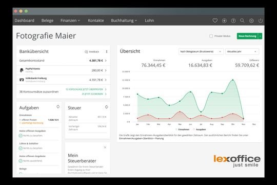 Lexware Office gehört zu den Allround-Lösungen im Buchhaltungsvergleich. Die Software-Basis liefert alle wichtigen Standard-Funktionen für die Angebots- und Rechnungserstellung und die Kundenverwaltung. In größeren Paketen stockt Lexware Office die Features auf und erweitert um ELSTER-Schnittstellen und die Verwaltung von Anlagegütern. Dabei besticht das Tool mit einem guten Preis-Leistungs-Verhältnis und einer intuitiven Bedienbarkeit. Zu Beanstanden gibt es nur wenig.