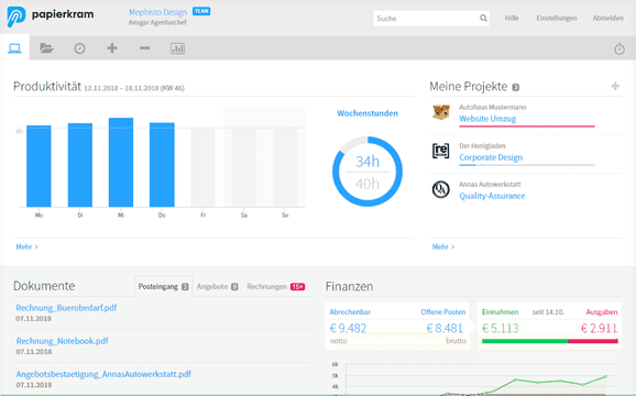 Von der Angebotserstellung bis zur Umsatzsteuererklärung deckt Papierkram prinzipiell die wichtigsten Funktionen ab, die kleine Unternehmen für Ihre Buchhaltung, ihr Projektmanagement sowie ihre Warenwirtschaft benötigen.