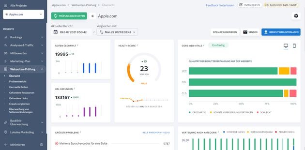 Durch die Echtzeit-Daten sollen SEOs und Content Creator in die Lage versetzt werden, das Ranking bestehender Seiten effektiv zu steigern und neue Seiten durch eine umfassende Keyword-Planung hoch einsteigen zu lassen. SE Ranking bietet eine übersichtliche und moderne Benutzeroberfläche, in der sich sowohl Einsteiger:innen im SEO, als auch Profis und Agenturen schnell zurechtfinden, um die wichtigsten Zahlen und Daten abzurufen. Einziges kleines Manko ist aktuell noch die deutsche Übersetzung des ursprünglich englischsprachigen Tools; diese fällt teilweise ein wenig inkonsistent aus und ist noch unvollständig, wird aber stetig verbessert.