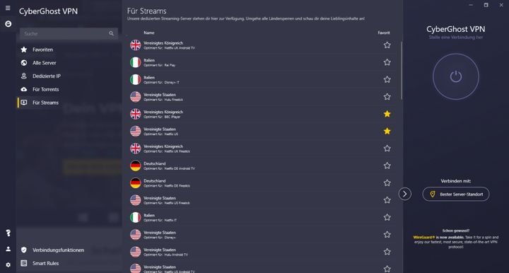 CyberGhost ist eines der bekanntesten VPN auf dem Markt und gilt als eines der ersten kommerziellen VPN-Systeme. CyberGhost unterstützt eine große Bandbreite an Geräten, von Android-Smartphones und -Tablets über Windows, Mac und Linux, bis hin zu diversen Browsern, Smart TVs und Spielekonsolen. Zudem überzeugt CyberGhost durch solide Geschwindigkeiten, ein großes Servernetzwerk und einen besonders günstigen Preis.