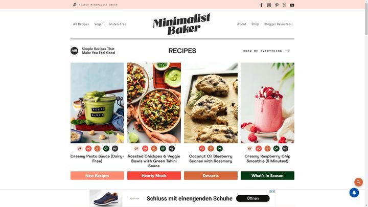 Minimalist Baker ist (anders, als der Name vermuten lässt) kein reiner Back-Blog, sondern bietet dir eine ganze Reihe an unterschiedlichen Rezepten. Dabei gibt es ganz im Sinne des aktuellen Zeitgeistes eigene Bereiche für vegane und glutenfreie Köstlichkeiten.